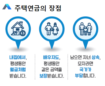 내 집에서 평생 동안 매월 일정금액을 받으며 노후생활을 보장받을 수 있습니다. 만약 주택연금 수급자가 사망할 경우 주택가격이 주택연금 받은 금액보다 높을 경우 자녀에게 상속이 진행되며 주택연금 수급액이 주택가격을 넘어서더라도 차액은 국가가 부담하게 됩니다.