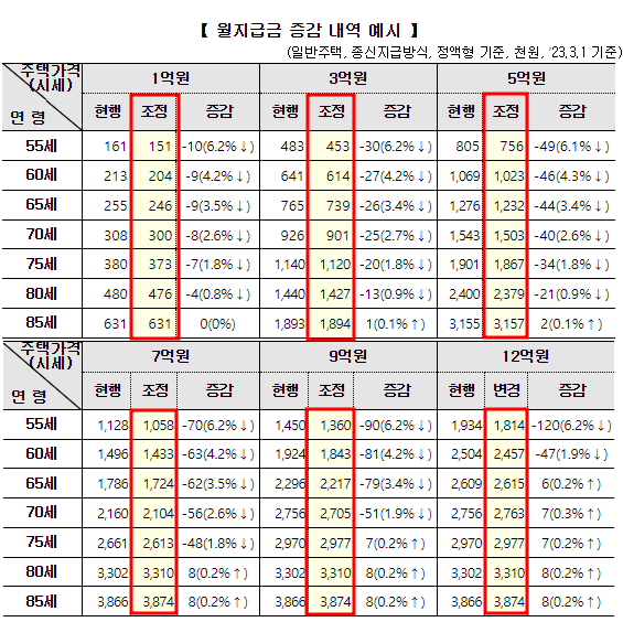 3월 1일 신규 신청자부터 주택연금 월지급금이 기존보다 평균 1.8% 줄어들게 됩니다. 조정 이유는 전년 대비 예상 주택가격 상승률이 낮아지는 반면 이자율은 상승했고 기대 수명이 늘어나 월지급금 감소 요인이 되었습니다.