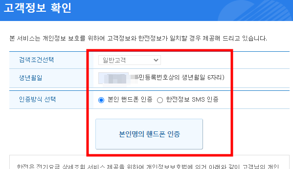 ■ 고객정보 확인화면에서 검색조건을 선택▶ 생년월일 입력 ▶ 본인 핸드폰 인증을 합니다.