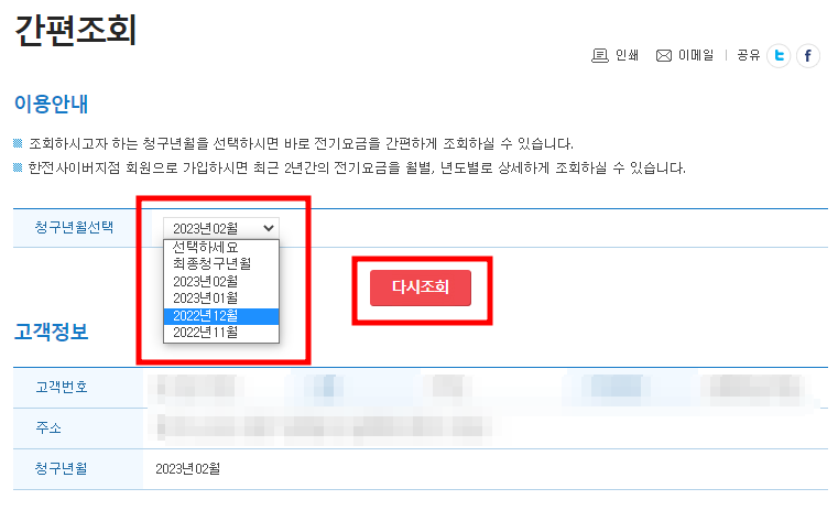 ■ 간편조회 탭에서 고객번호 탭을 선택하여 입력 ▶ 조회하고싶은 청구연월일선택하여 조회합니다.