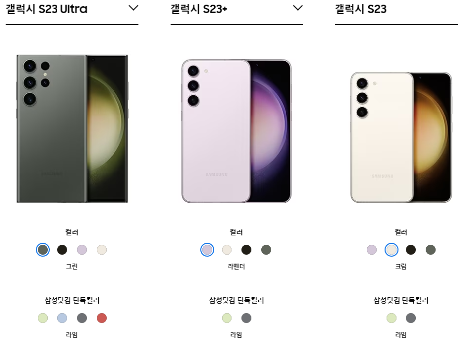 크림, 라벤더, 그린, 팬텀 블랙 4가지 색상을 출했습니다. 갤럭시 s23 색상은 목화와 라벤더, 숲 등 자연에서 영감을 받은 컬러를 구현했습니다.