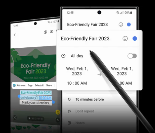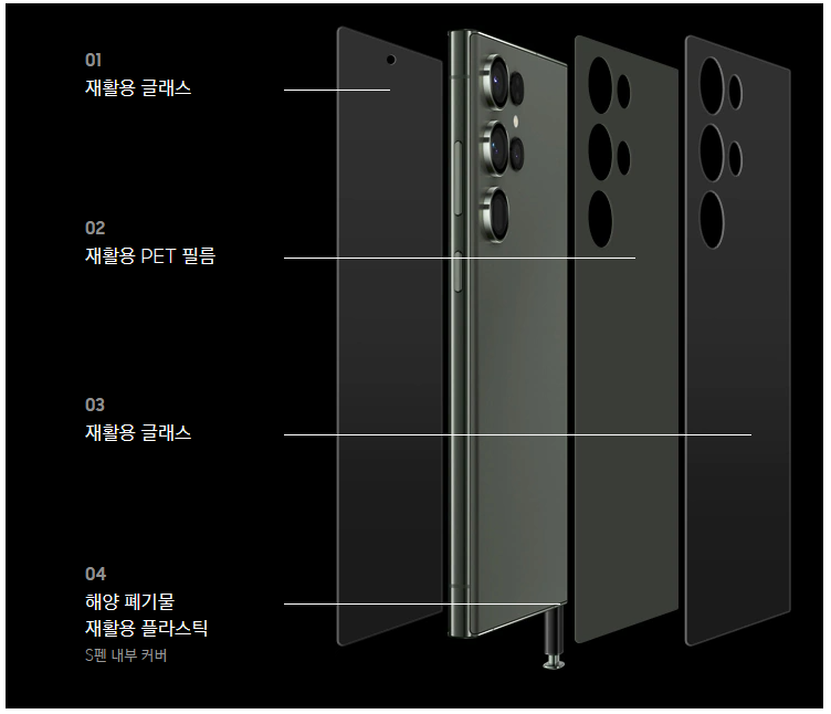 갤럭시 s23 울트라에는 12개의 재활용 소재인 폐어망 재활용 소재를 20% 활용하여 S펜 커버 하단, 하단 스피커 모듈에 적용했습니다. 이번 갤럭시 s23 시리즈에는 폐페트병, 알루미늄 부산물을 활용하여 지구를 위한 친환경적인 재료를 사용했습니다.