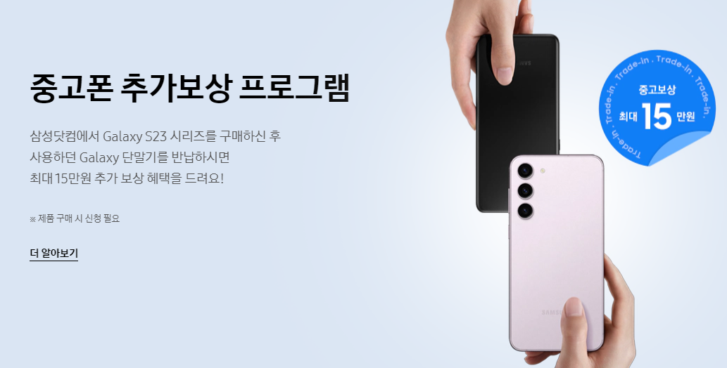사용중인 폰을 반납하는 조건으로 최대 15만원의 추가 할인을 받아볼 수 있습니다. 중고폰 추가보상 프로그램은 제품시 같이 신청해야하며 신제품 배송 완료 후 별도로 구형 단말기 반납이 필요합니다.