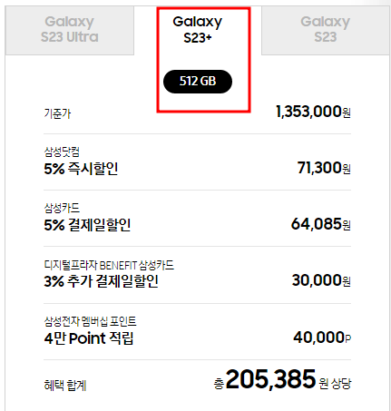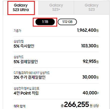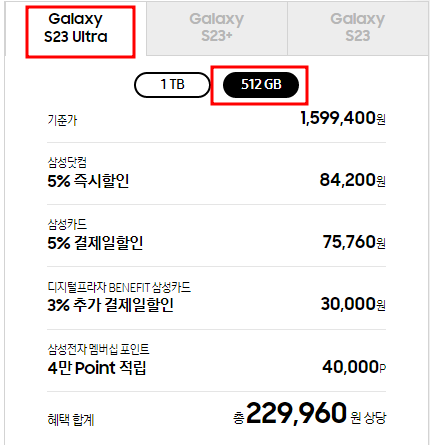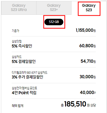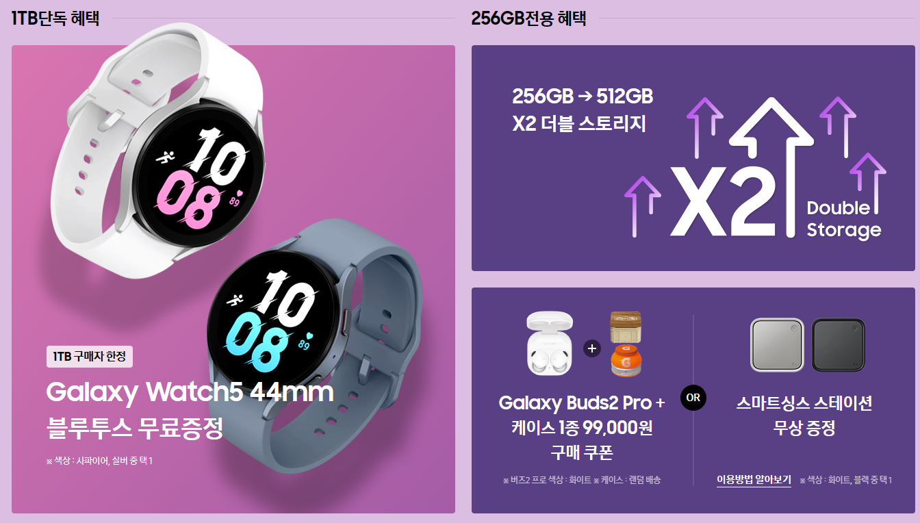 사전예약 기간동안 갤럭시 S23 시리즈 256GB를 구입할 경우 512GB 단말기로 무료 업그레이드가 혜택이 주어집니다. 256GB 구입을 계획중이라면 사전예약 기간에 구입하셔서 15만원 상당의 혜택을 받아보시기 바랍니다.