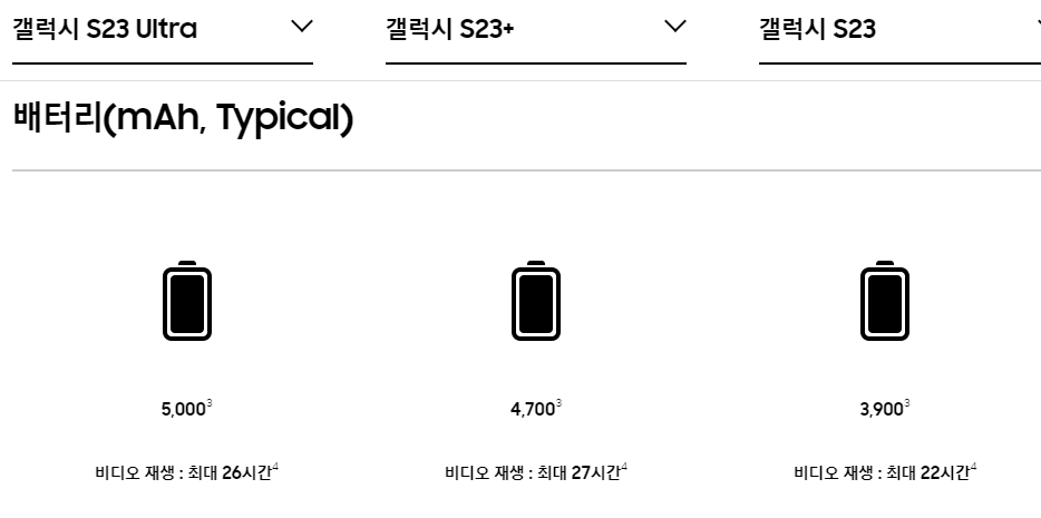 | 갤럭시 s23 | 3,900mAh |