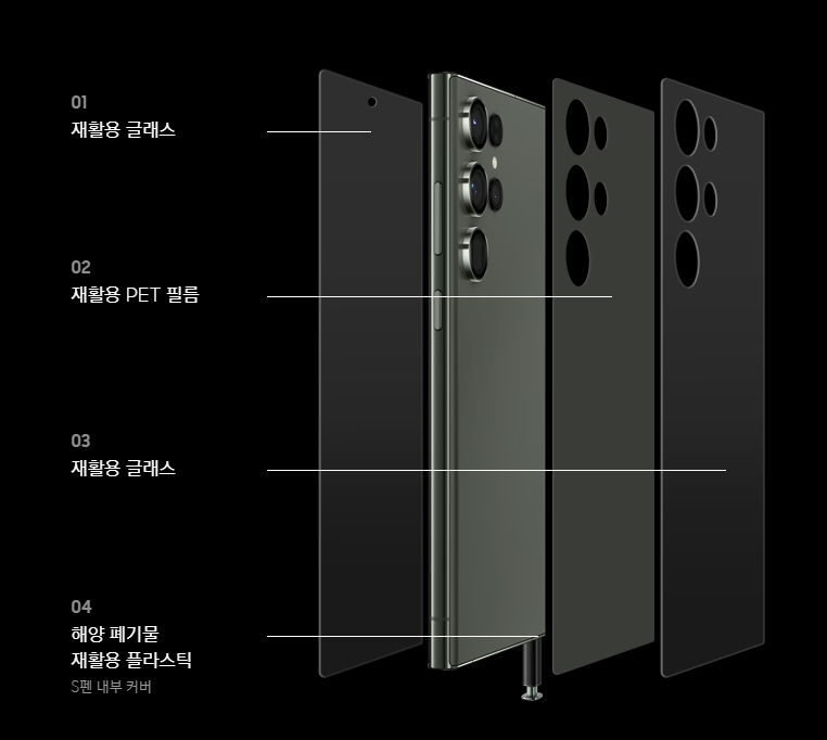 이번 갤럭시 s23 시리즈에는 고릴라글라스빅터스 2가 적용되었으며 아머 알루미늄 프레임을 사용하여 내구성을 향상했고 방수, 방진 IP68 등급으로 생활 방수가 가능하여 마음 편히 사용할 수 있습니다. 갤럭시 s23 울트라에는 12개 재활용 소재인 폐어망 소재를 20% 사용했고, 그 외에도 폐페트병, 알루미늄 부산물을 활용하여 친환경적 소재를 사용했습니다.