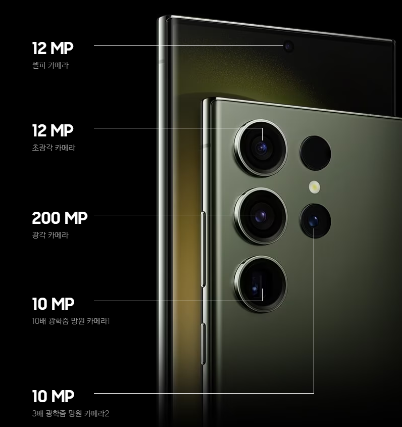 갤럭시 s23 울트라에는 1200만 화소 셀피카메라, 1200만 화소 초광각 카메라, 1000만 10배 광학줌 망원 카메라와 1000만 3배 광학줌, 2억 화소 메인 후면 광각 카메라로 5개의 카메라가 탑재되었습니다.
