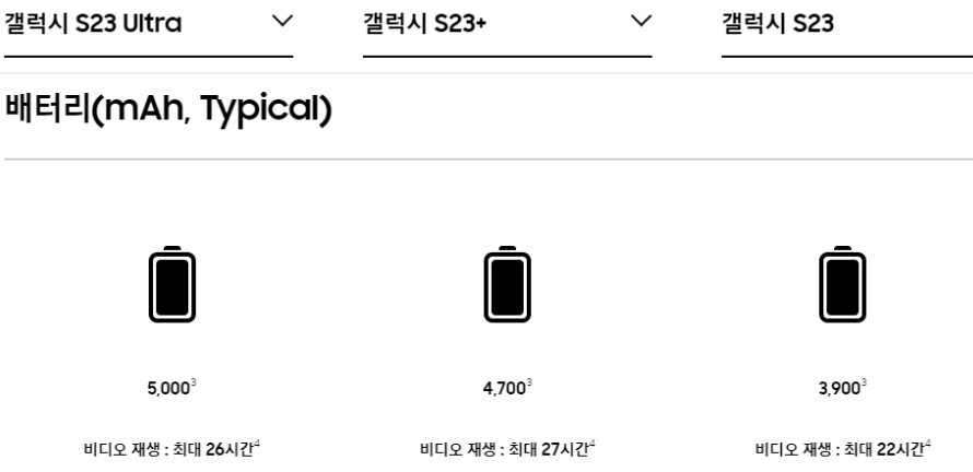 갤럭시 s23 , 갤럭시 s23 플러스는 전작대비 200mAh 용량이 증가했고, 갤럭시 s23 울트라는 전작과 동일한 5000mAh 배터리 용량이 적용되었습니다.