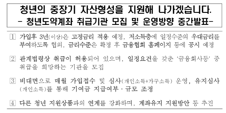 현 정부의 주요 국정과제 중 하나였던 청년도약계좌가 23년 6월 출시될 예저입니다. 청년의 중장기적 자산형성을 지원하며 청년에게 공정한 도약의 기회를 보장하는 취지의 청년도약계좌 가입자격,금리에 대해 알아보도록 하겠습니다.