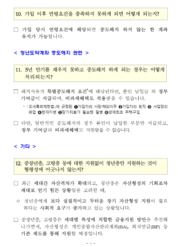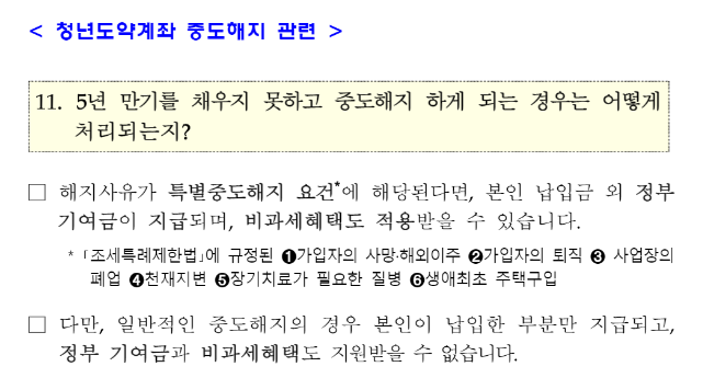 ※ 위 조건에 해당되지 않는 일반적인 중도해지는 본인이 납입한 금액만 지급되고, 정부 기여금과 비과세혜택을 받을 수 없습니다.