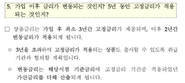 ■ 청년도약계좌 상품은 가입후 3년은 고정금리, 이후 2년은 변동금리(해당시점 기준금리 + 고정금리 기간 중 적용되었던 가산금리) 가 적용될 예정입니다.