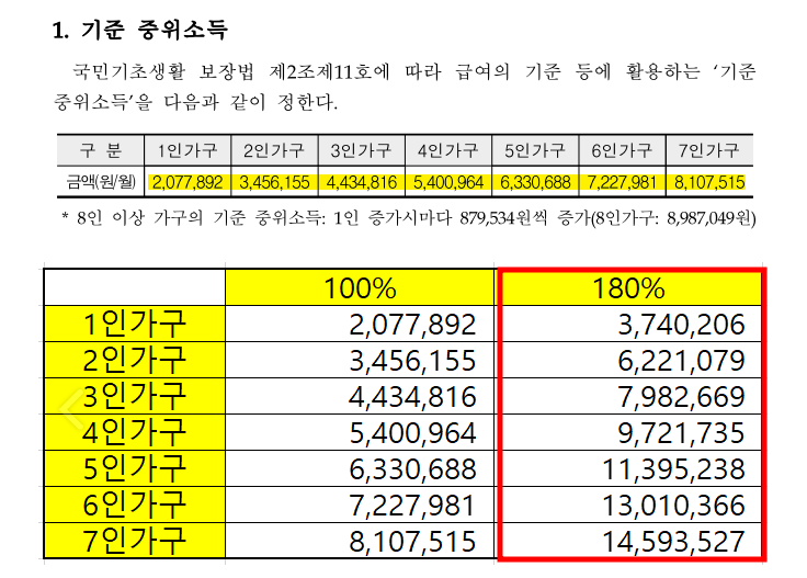기준 중위소득이란 보건복지부 장관이 중앙생활보장위원회의 심의·의결을 거쳐 고시하는 국민 가구소득의 중간값을 말합니다.