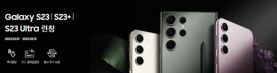 삼성닷컴에서는 3월1일~3월31일 사이 런칭 기념 이벤트로 8% 즉시할인, 6% 삼성카드 청구할인, 중고 추가보상 최대 15만 원 혜택을 받을 수 있습니다.