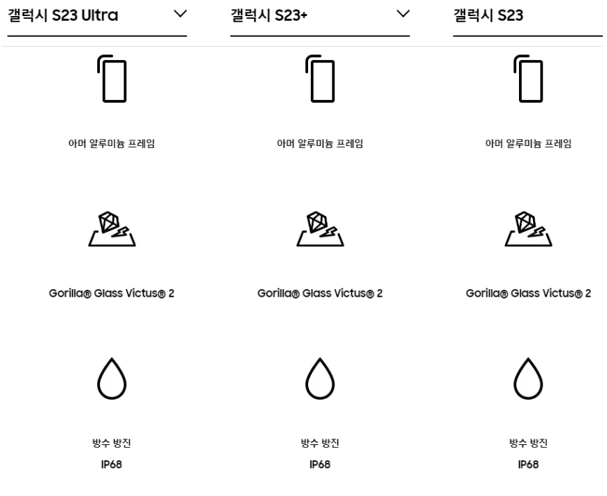 갤럭시 s23 시리즈에는 고릴라글라스빅터스 2가 탑재되어 별도의 화면 보호 필름을 붙이지 않을 정도로 강화된 유리를 선보였습니다. 아머 알루미늄 프레임을 사용하여 내구성을 향상했고 방수, 방진 IP68 등급으로 생활 방수가 가능한 기능이 포함되었습니다.