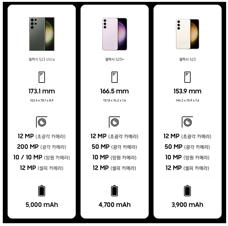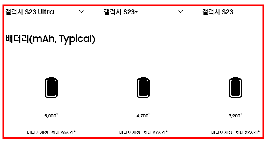 갤럭시 S23과 플러스모델은 전작대비 200mAh 넉넉해졌고, 갤럭시 s23 울트라는 전작과 동일한 5000mAh 용량이지만 효율 개선을 통해 제품 사용시간을 기존 보다 늘렸습니다. 배터리 완충시 하루종일 휴대폰을 사용해도 무방할 정도로 만족스럽다는 후기가 이어지고 있습니다.