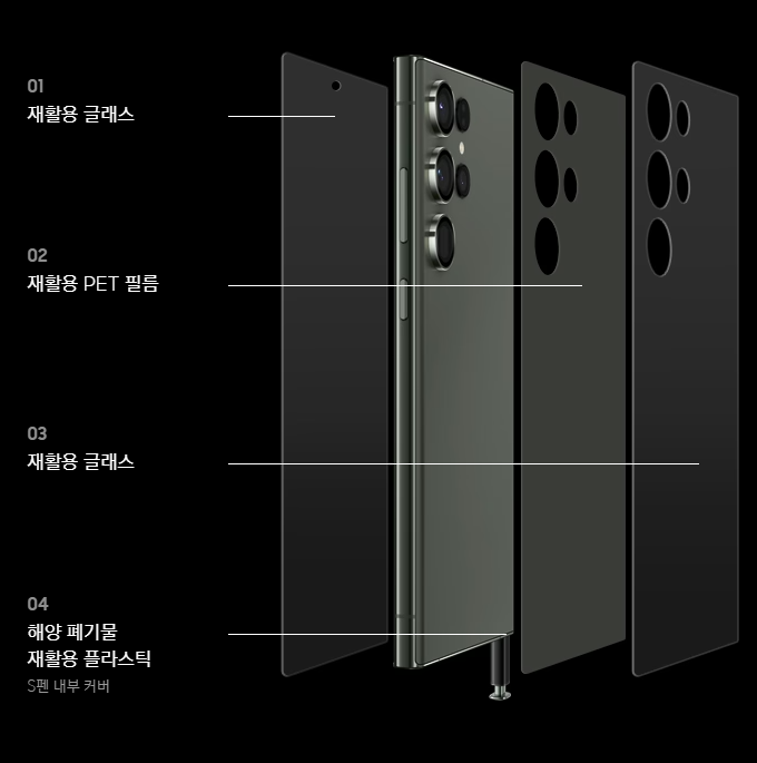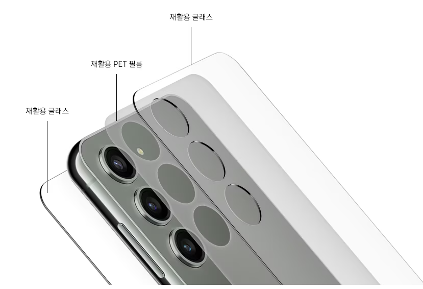 갤럭시 s23 시리즈에는 폐어망,폐페트병,알루미늄 부산물을 활용하는 등 친환경 소재를 사용했습니다. 삼성전자는 2030년까지 제품에 쓰이는 플라스틱 부품 중 50%를 사용하고, 2050년까지는 100% 재활용 소재를 활용하여 갤럭시 제품에 사용되는 부품 중 일회성 플라스틱을 완전히 제거하는 것을 목표로 하고 있다고 밝혔습니다.