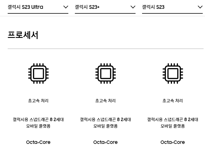 갤럭시S23 시리즈는 울트라를 비롯해 전 시리즈 모델에 최신형 AP 인 '스냅드래곤8 2세대'가 탑재되었습니다. AP는 스마트폰의 두뇌로서 성능, 배터리, 발열 등 기기 성능을 결정하는 핵심 부품입니다. 갤럭시 맞춤형으로 CPU 성능이 전작보다 34% 향상되었고, GPU 성능은 41%, NPU 성능 49% 향상되었습니다.