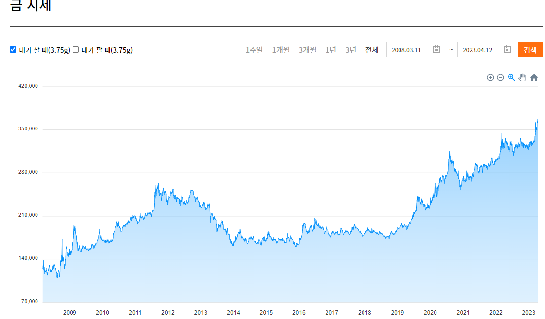 금 시세는 연일 상승세를 보이고 있습니다. 경기침체, 우려, 금융불안, 강달러, 고금리가 상승세가 한풀 꺾이면서 금 투자 상품이 인기를 끌고 있는 겁니다. 12일 기준 금 1g당 85,957원으로 1돈을 살 때 367,000원 팔 때는 305,000원에 거래되고 있습니다.