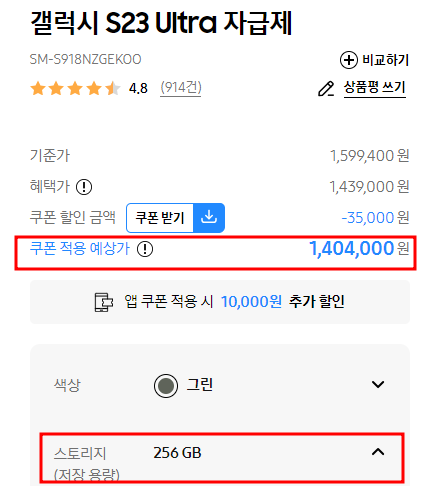 쿠팡 사이트에서는 갤럭시 S23 울트라 256G[1,359,490원] 512GB[1,462,340원] 에 판매 중이며 오늘 기준 최대 6% 카드 할인을 받을 수 있습니다.