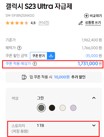 삼성전자 공식 홈페이지에서는 갤럭시 s23 울트라 자급제 256GB~1TB 판매중이며 쿠폰 할인 적용받아 1,404,000원~1,731,000원에 구입할 수 있습니다. 앱 쿠폰 적용 시 1만 원 추가 혜택을 받을 수 있습니다.