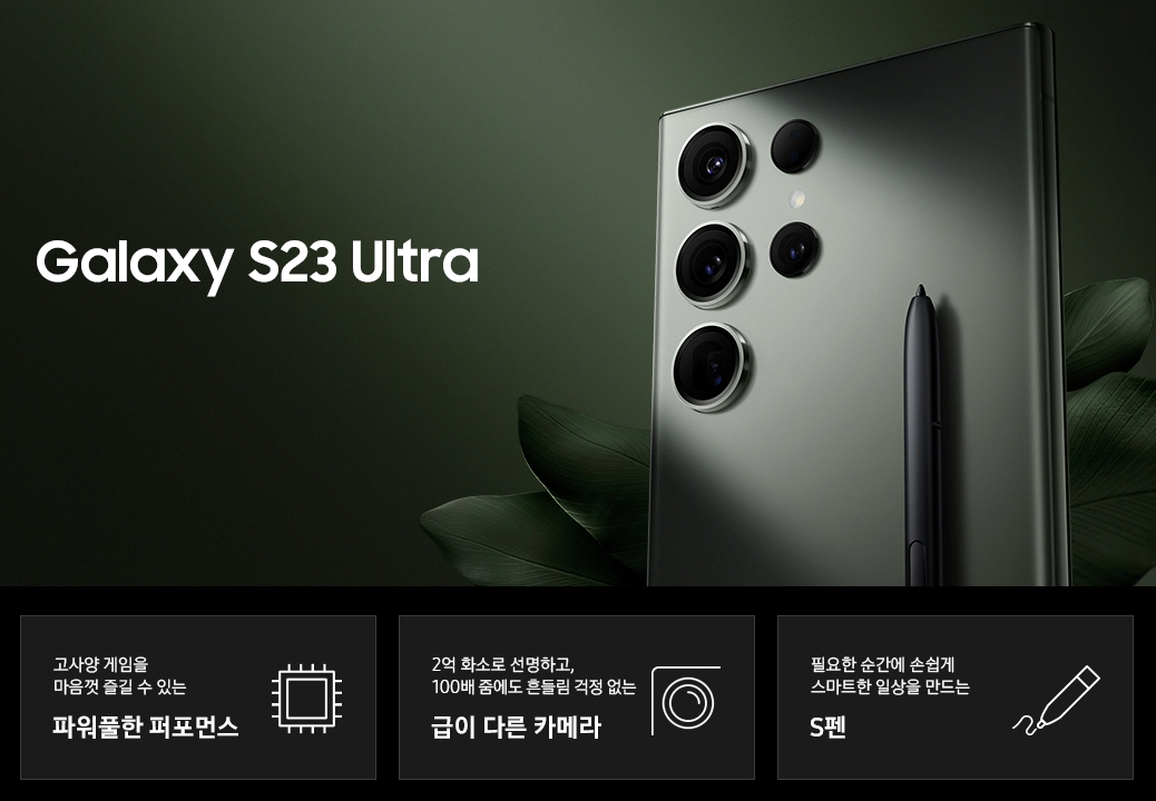 ■ 갤럭시 s23 울트라 모델의 경우 전작대비 외관상 별다른 차이점이 보이지 않지만 엣지 곡률이 전작대비 줄어 더 각진듯한 느낌을 받을 수 있습니다. 노트의 시그니처였던 노트펜이 갤럭시 울트라의 상징 S펜이 적용되었습니다.