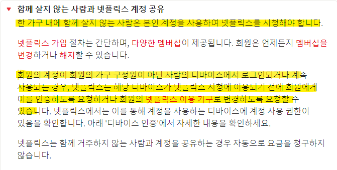 계정을 공유하기 위해서는 최소 한달에 한번씩 기본 위치 와이파이에 접속해 넷플릭스 앱 또는 사이트에서 영상을 재생하여 한 가구에 거주한다는 것을 인증해야 합니다. 넷플릭스 자체 판별 과정에서 가족이 아니라고 판단되면 콘텐츠 시청을 할수 없게 됩니다.