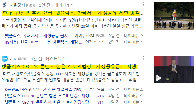 넷플릭스가 국내에서도 계정 공유 금지를 추진하겠다고 선언 이후 구체적인 시행 시점은 공개하지 않고 있습니다. '사랑은 비밀번호를 공유하는 것'이라던 넷플릭스가 돌연 입장을 바꿔 계정 공유 금지에 나선겁니다. 지난달 23일 미국에서도 넷플릭스 계정공유를 시행하하면서 다른 사람과 계정을 함께 사용할 경우 한달에 7.99달러 이상의 요금이 발생하거나 신규 가입을 안내하고 있습니다.