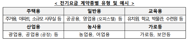 전기요금 계약종은 일반용,산업용,농사용,교육용, 주택용 중 비주거용 유형이 있으며 계약종은 전기요금 고지서에서 확인할 수 있음, 파악이 어려울 경우 한국전력 콜센터(☎123) 전화하여 고객번호로 확인가능