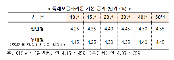 주택가격 6억 원 이하, 소득 1억 원 이하 조건에 맞을 경우 상환기간에 따라 우대형의 경우 4.15~4.45%이며 일반형은 4.25~4.55% 금리가 결정되었습니다.