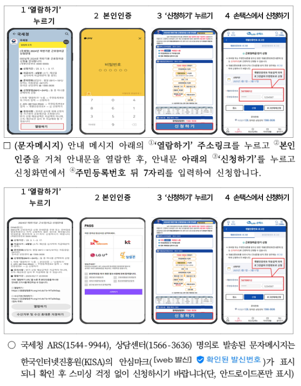 국세청에서 보내는 신청 안내 문자를 받은 경우, 링크를 통해 간편하게 신청이 가능합니다. 단, 근로장려금 신청을 빙자한 스미싱 문자나 보이스피싱에 주의해야합니다. 국세청은 어떠한 금융 정보나 금품을 요구하지 않습니다.