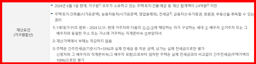 2024년 6월 1일 기준으로, 신청자와 배우자, 자녀를 포함한 가구 전체의 재산 합계가 2억 4천만 원 미만이어야 합니다.