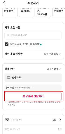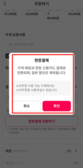 - 주문 후 현장에서 카드나 지류 상품권으로 결제
