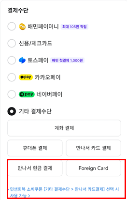 - 모든 결제가 앱 내에서 자동 처리되기 때문에 지역화폐 및 상품권 결제 연동이 불가합니다.