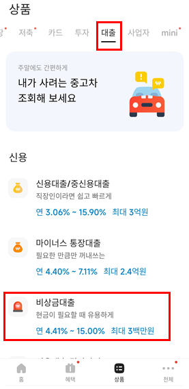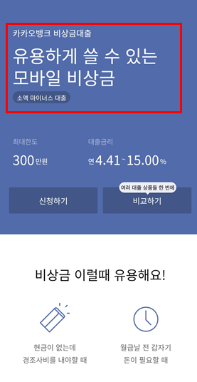 카카오뱅크 비상금대출은 최대 300만 원까지 이용 가능한 소액대출 상품입니다.