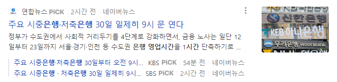 지난 21년 7월 수도권 은행 영업시간을 오전 9시 30분~오후 3시 30분으로 1시간 단축영업을 시행했습니다. 당시 코로나19 사회적 거리두기 4단계로 강화 이후 같은 해 10월 전국 영업점에서 1시간 단축영업이 확대되었습니다.