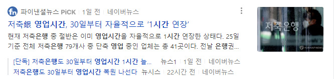 저축은행중앙회도 25일 "30일부터 코로나19 확산 전 영업시간이 정상화 될 수 있도록 협조해 달라"는 공문을 보내 저축은행도 30일부터 정상영업에 들어설 것으로 보입니다.