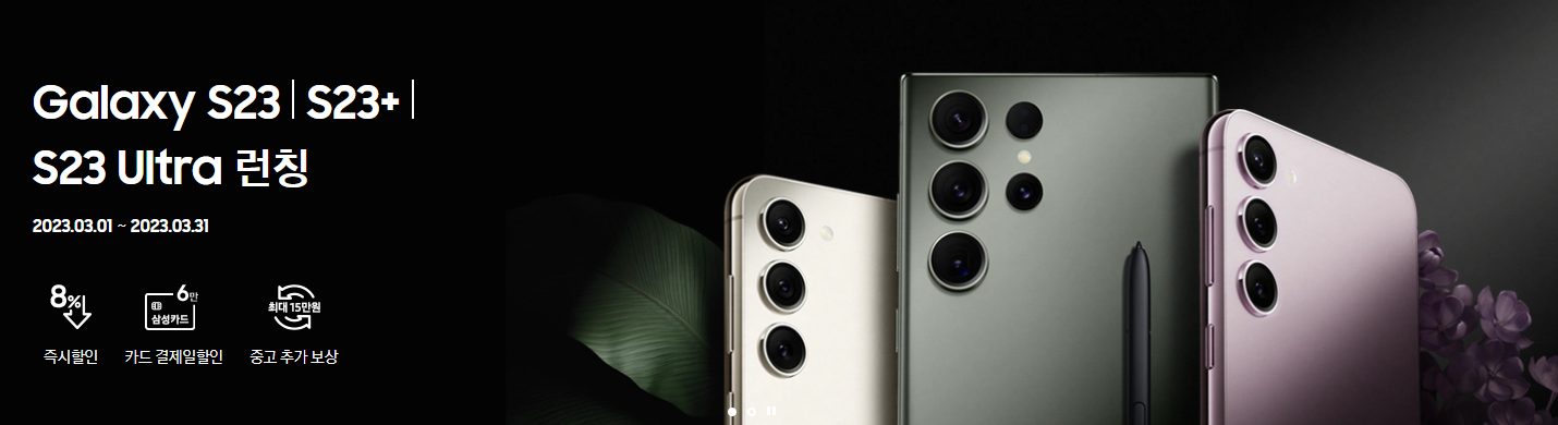 갤럭시 s23 시리즈 출시 가격갤럭시 s23은 전작대비 단말기 가격이 15% 인상된 가격을 책정했습니다. 현재 삼성닷컴에서는 3월1일~3월31일 사이 런칭 기념 이벤트로 8% 즉시할인, 6% 삼성카드 청구할인, 중고 추가보상 최대 15만 원 혜택을 받을 수 있습니다.
