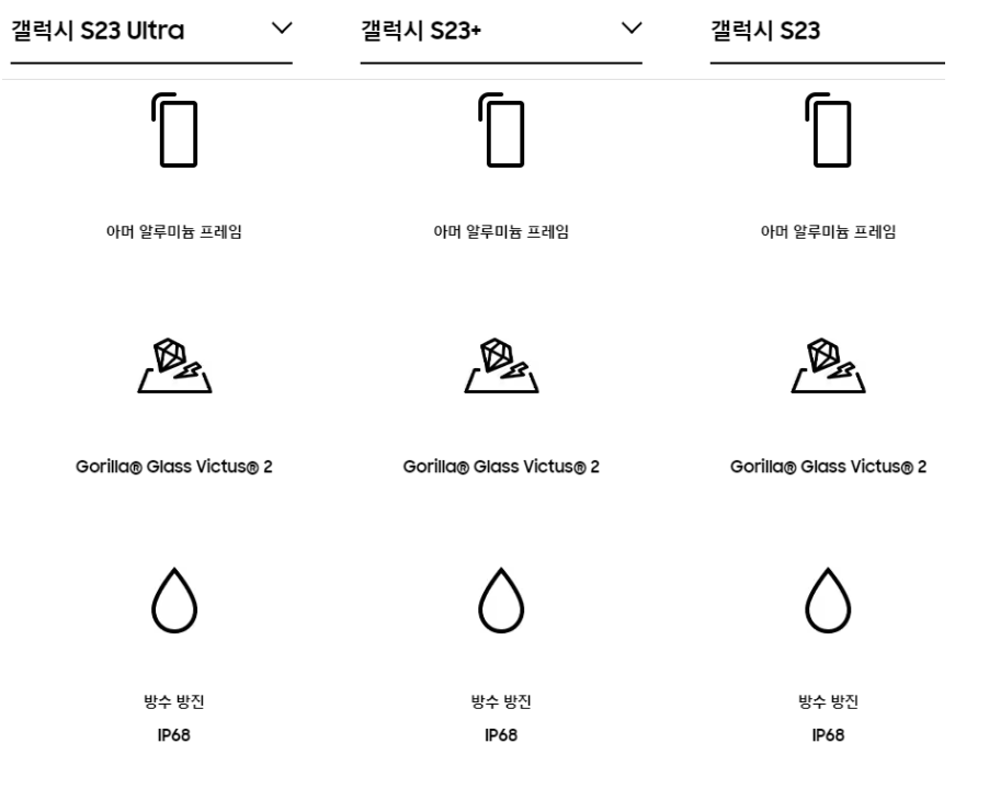 갤럭시 s23 시리즈에는 고릴라글라스빅터스 2가 탑재되어 별도의 화면 보호 필름을 붙이지 않을 정도로 강화된 유리를 선보였습니다. 아머 알루미늄 프레임을 사용하여 내구성을 향상했고 방수, 방진 IP68 등급으로 생활 방수가 가능한 기능이 포함되었습니다.