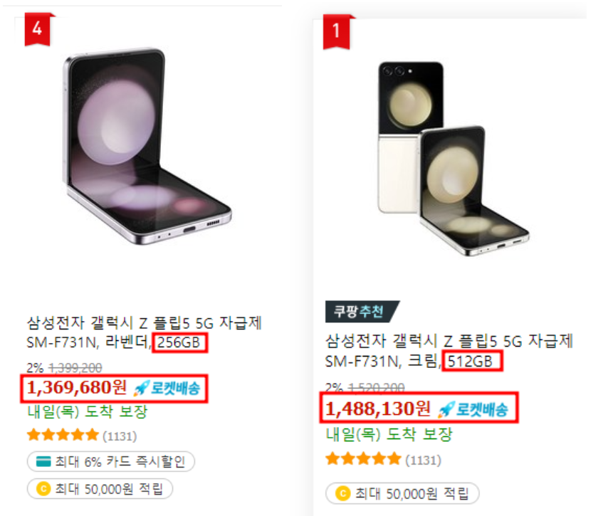 쿠팡사이트에서는 현재 카드할인혜택을 적용하여 갤럭시z플립5 자급제 256GB 1,369,680원, 512GB 1,488,130원 가격으로 판매하고 있습니다.